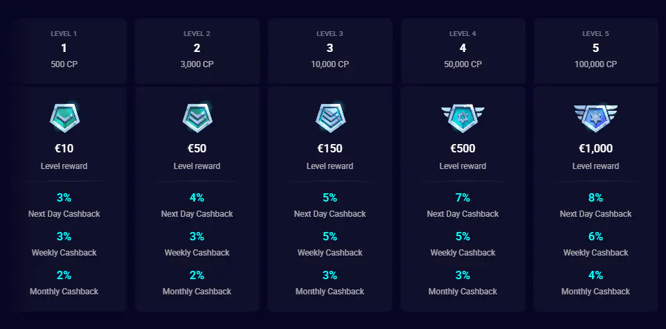- Tiered levels: Higher ranks unlock exclusive offers, increased withdrawal limits, and dedicated support.